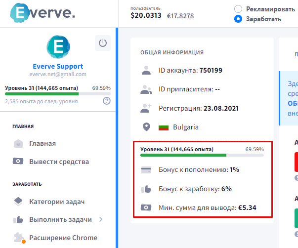 - Каждый новый уровень вашего аккаунта открывает новые преимущества: например, при достижении 50го уровня ваш бонус к заработку составит +10%, бонус к любому пополнению +3%, а минимальная сумма для вывода средств снизится до $5.5.