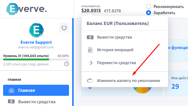Тем не менее, для удобства отображения, пользователям доступна смена валюты на любую другую. Выбор валюты доступен из финансового меню по клику на баланс пользователя или рекламодателя: